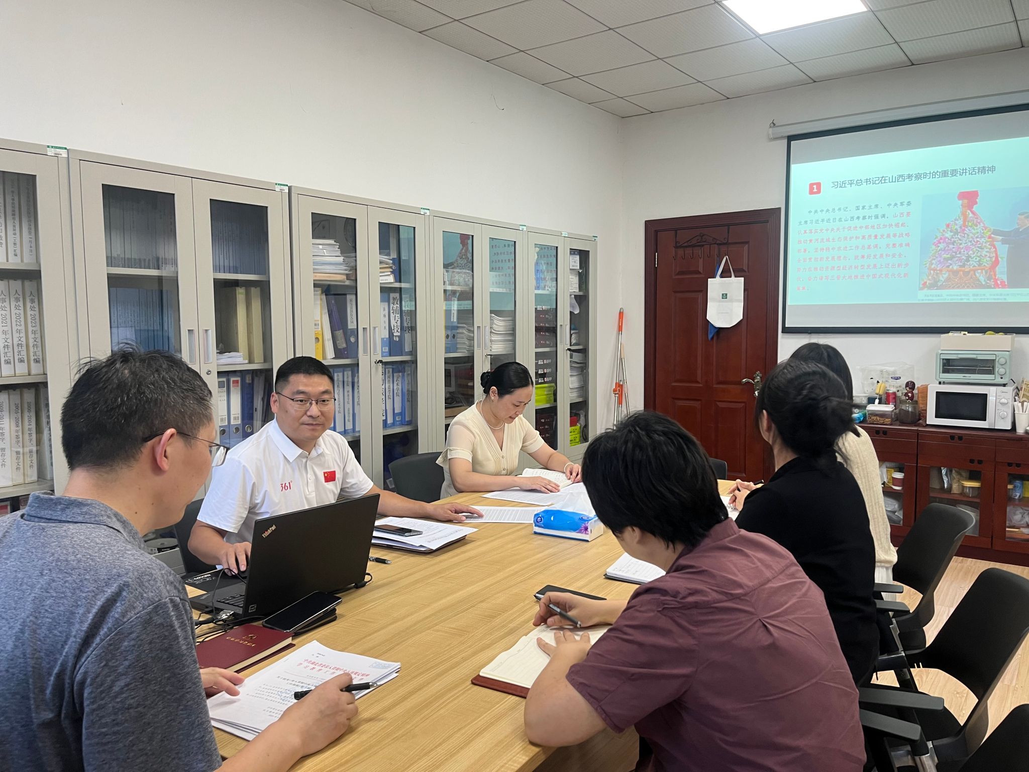 9月16日下午,人事处党支部在行政楼215办公室举行了9月支部主题党日活动,活动以“铭记抗战历史 发扬抗战精神 聆听时代强音”为主题,由支部书记张广弟主持,全体党员参加(樊晓明同志因借调外地,通过视频参会)。